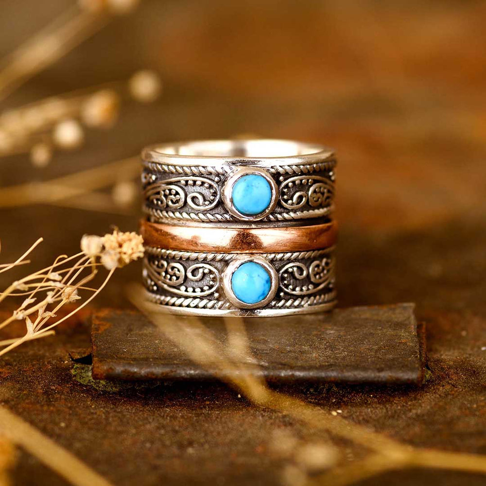 Two stone fidget ring with Turquoise stone. Made of sterling silver and copper.