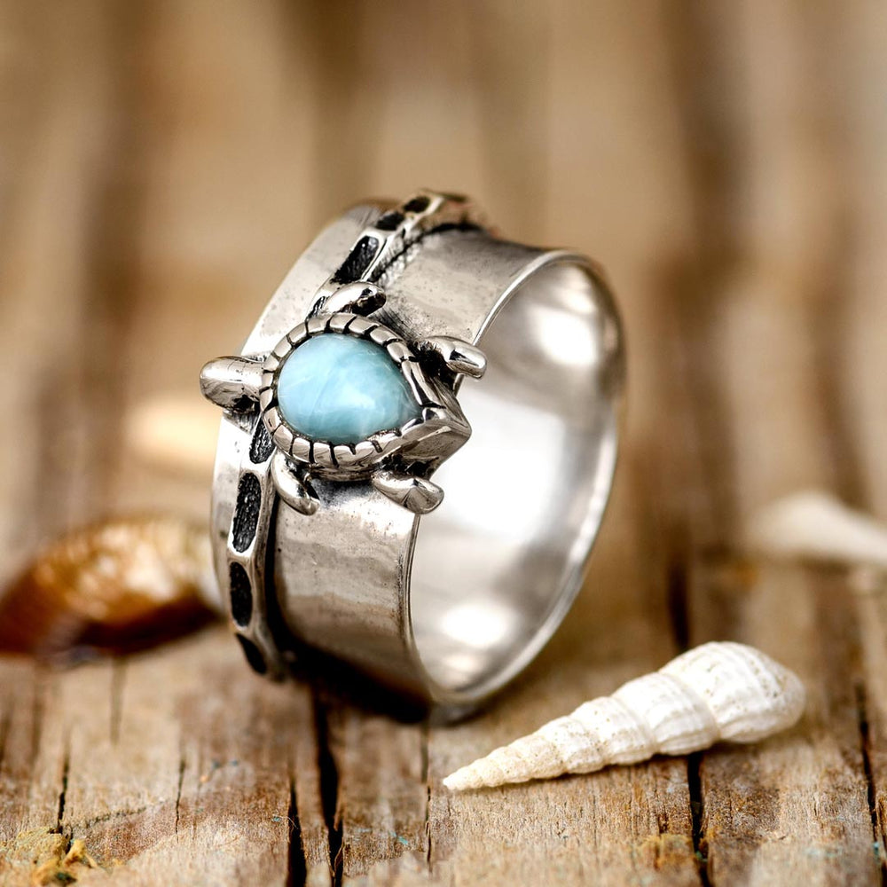 A lovely sterling silver spinner ring featuring a sweet sea turtle with a light blue Larimar gemstone. This ring is perfect for all those boho beach girlies and turtle lovers!