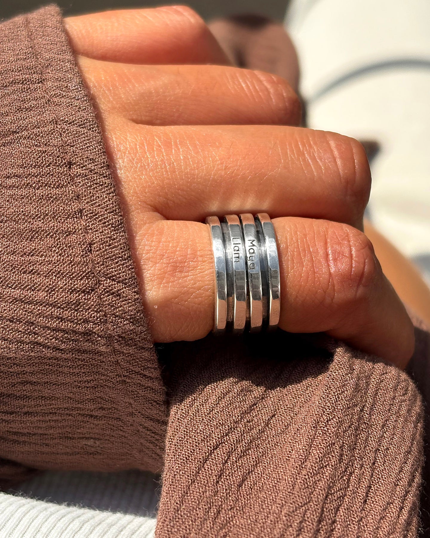 A sleek silver fidget ring that carries your words, your people, your meaning.