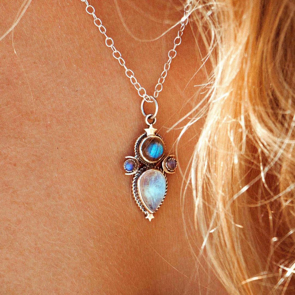 Diese mystische und himmlische Halskette verleiht deinem Look einen magischen Touch! Diese Halskette aus Sterlingsilber mit Labradorit- und Mondstein-Edelsteinen ist mit Halbmonden und Sternen verziert, die vom Kosmos inspiriert sind. Labradorit kann Selbstliebe, spirituellen Schutz und Intuition symbolisieren. Mondstein kann das Göttlich-Weibliche, Klarheit, Intuition und die Mondphasen symbolisieren.