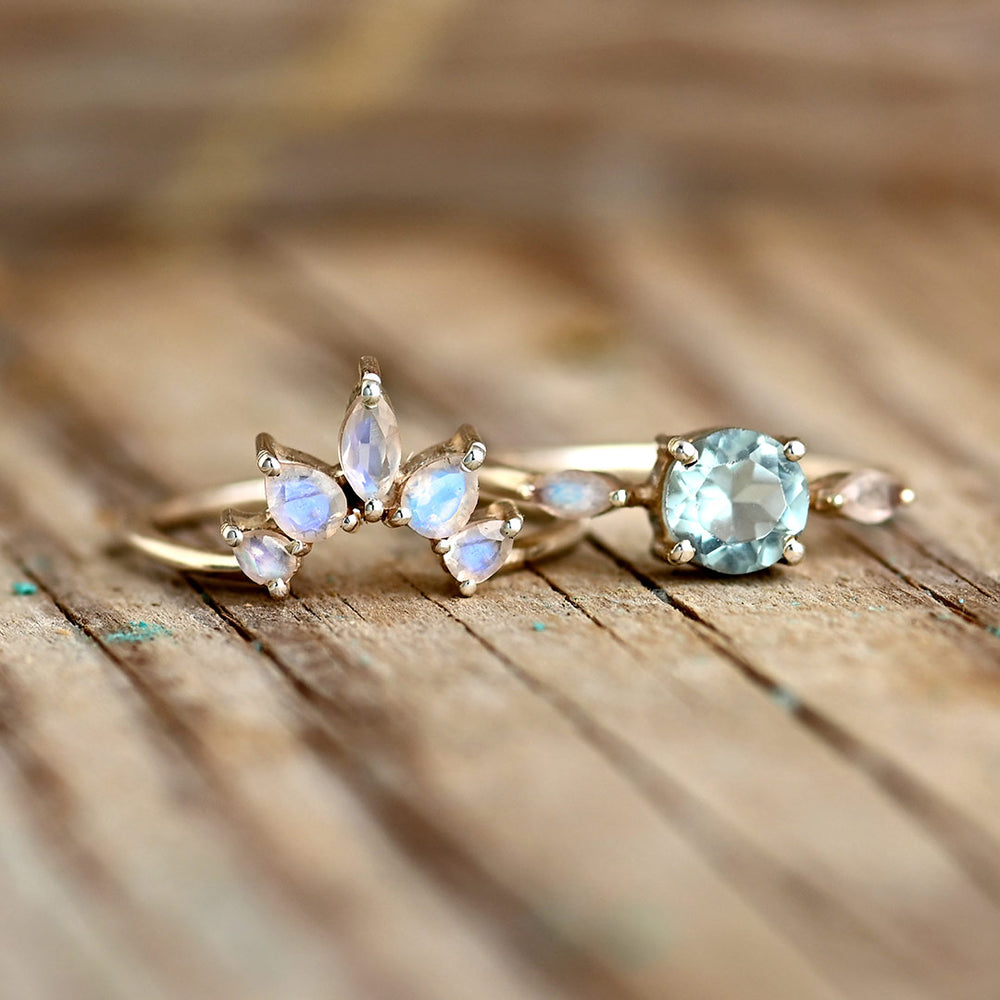 Aquamarine and Moonstone Stackable Ring Set Sterling Silver