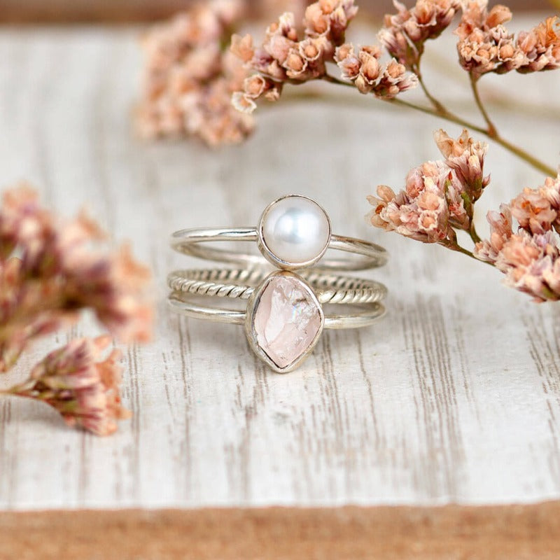 Pearl and Rose Quartz Stacking Ring Set Sterling Silver