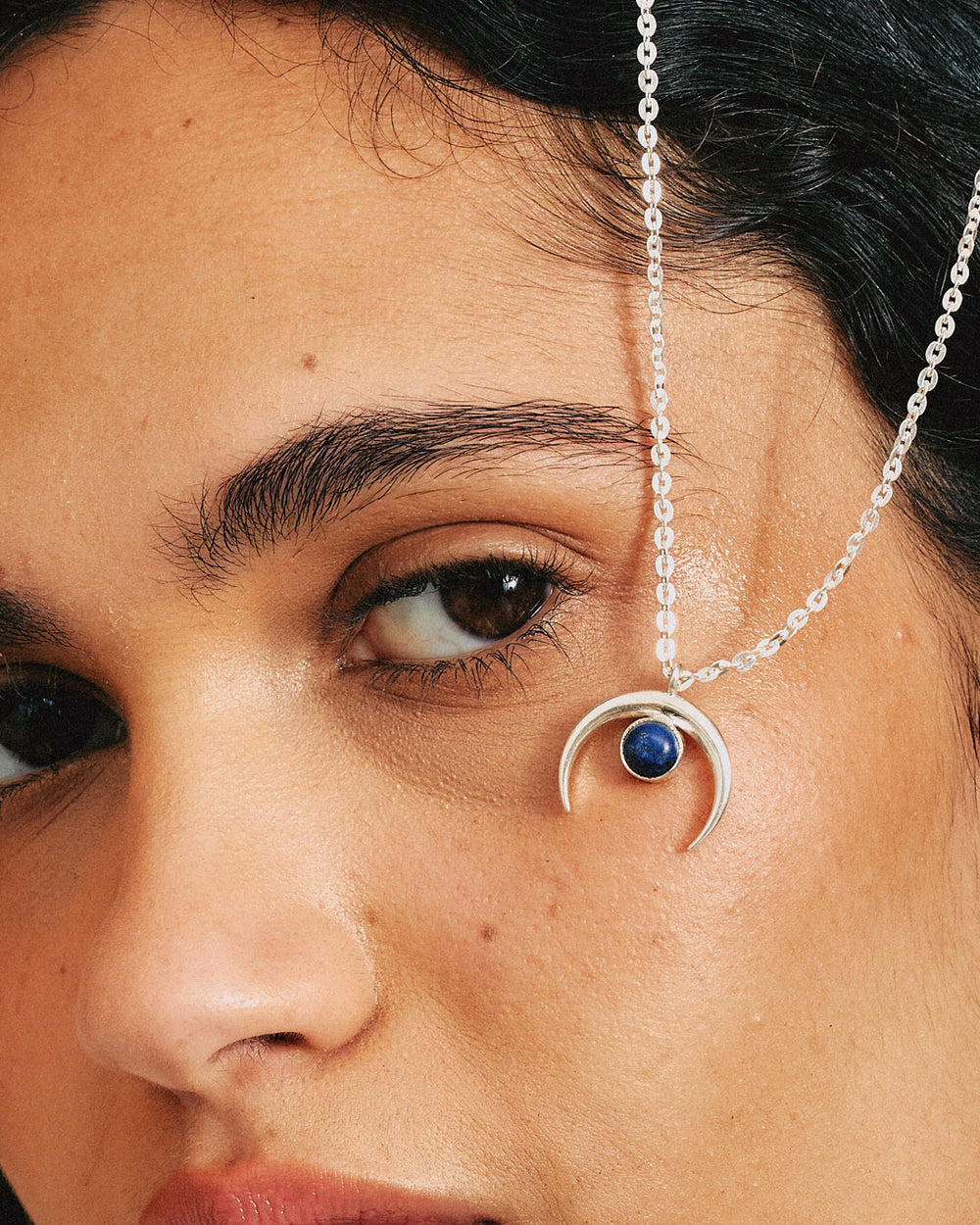 A statement necklace for moon lovers! This sterling silver necklace features a crescent moon design with a gorgeous blue lapis lazuli gemstone.