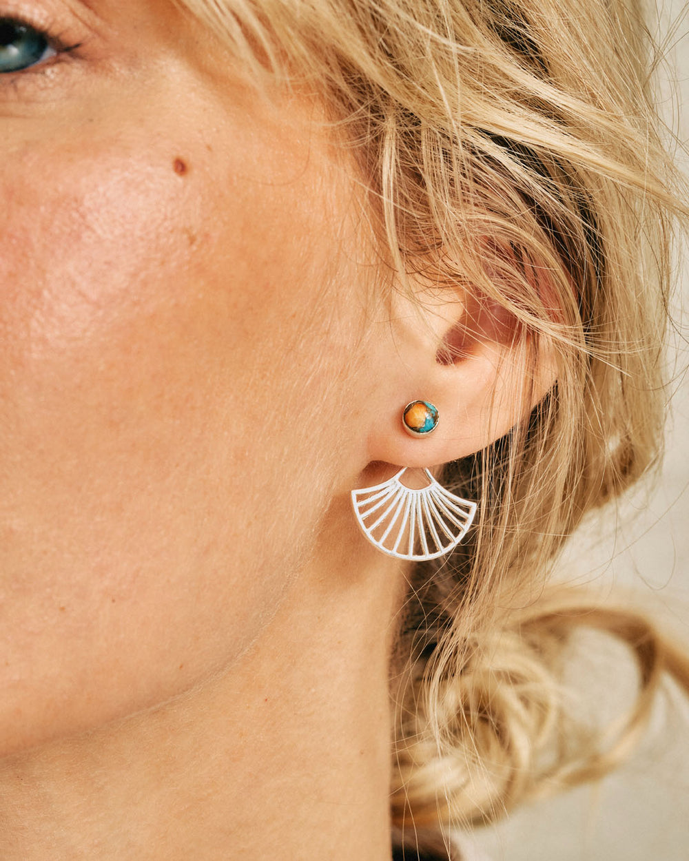 Oyster copper turquoise ear jacket earrings with a stunning sterling silver fan design that evokes the vibes of vintage jewelry. These versatile and dainty earrings will quickly become your everyday favorites!