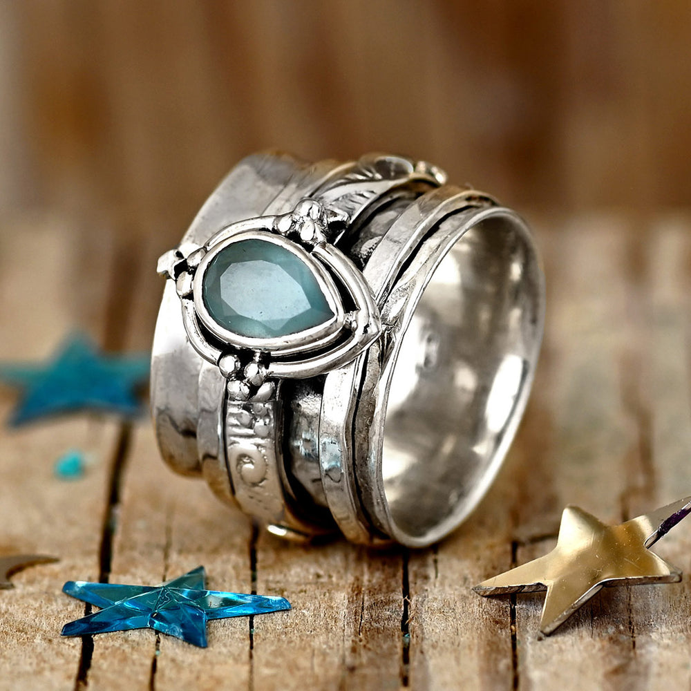 A wide-band sterling silver spinner ring with a teardrop genuine Aquamarine gemstone. This ring has multiple rings to spin which is satisfying to do in the moments where you need to re-direct your fidgeting!
