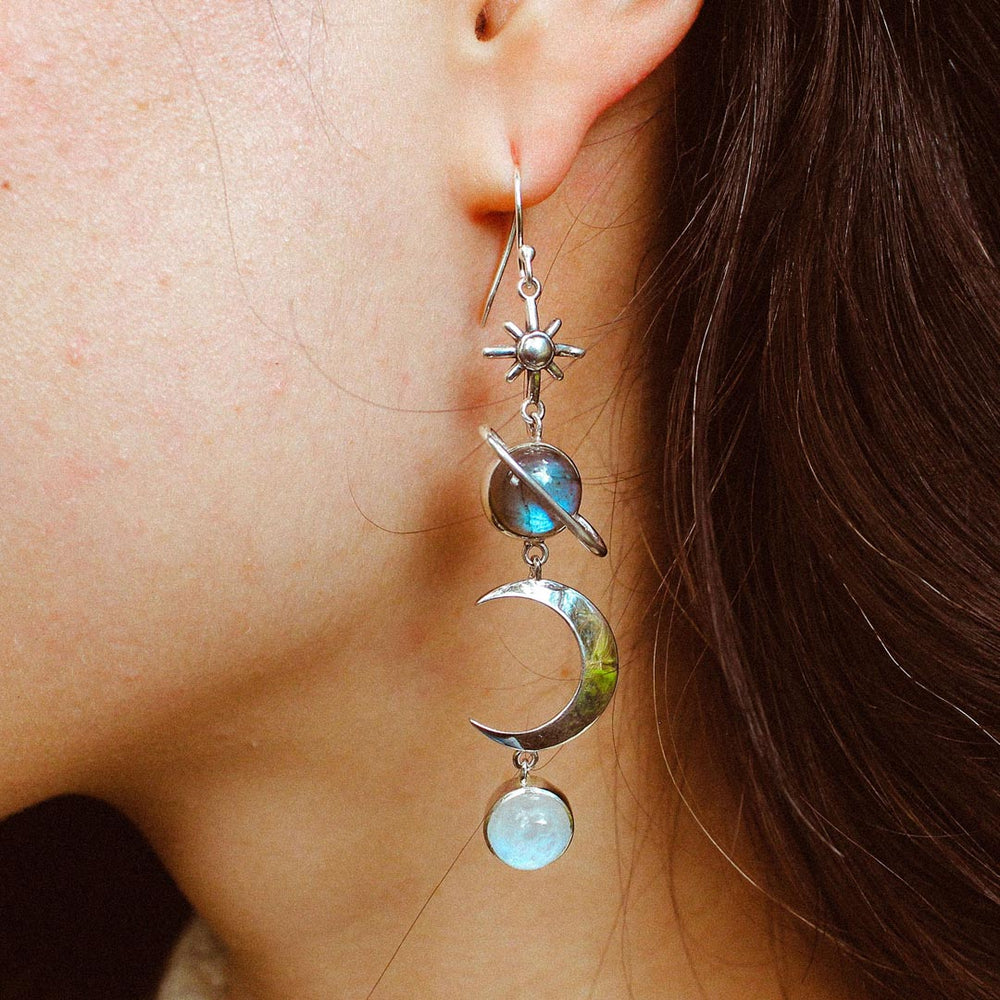 Stunning and sparkly celestial dangly earrings for boho women. These sterling silver earrings feature labradorite and Moonstone gemstones with celestial imagery including a star, planet Saturn and a crescent moon.