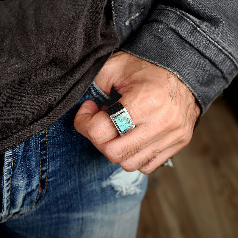Signet men's ring with natural Turquoise stone in square shape. Made of solid sterling silver that oxidized to make it a more blackened rustic look.