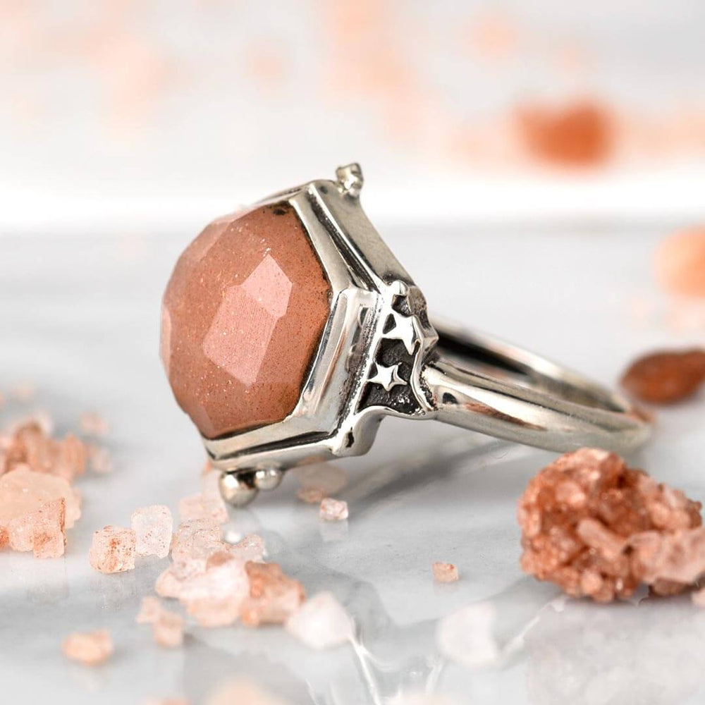 Connect to the cosmos with this faceted Peach Moonstone ring. Decorated with stars, this sterling silver ring is the perfect accessory for adding boho vibes to your outfit! Moonstone can symbolize the divine feminine, clarity, intuition and the moon phases.