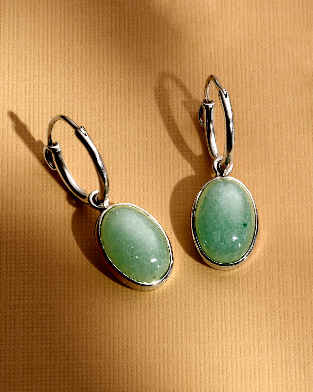 Oval aventurine gemstone earrings set in sparkling sterling silver. These earrings feature a leverback closure which will stay secure throughout the day.